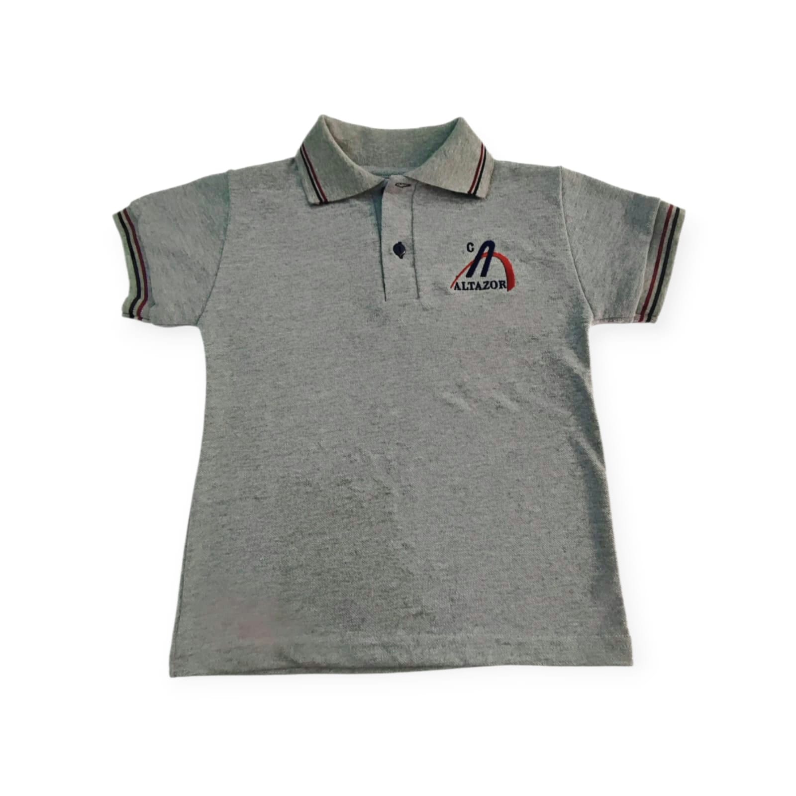 Polera piqué gris y cuello en el mismo tono con líneas azul y rojo manga corta.