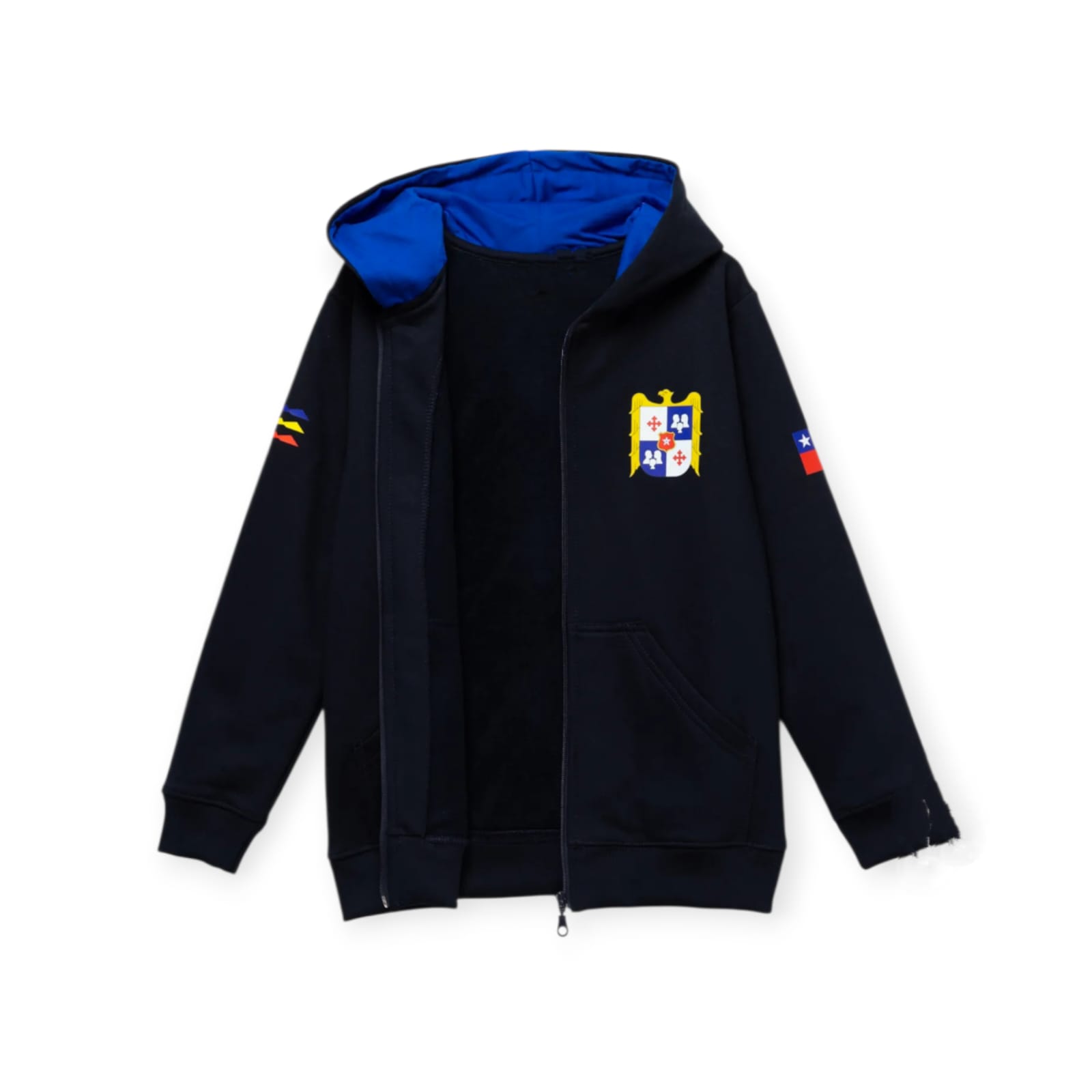 Polerón franela azul marino, cierre frontal, gorro y bolsillos tipo canguro con estampados en pecho, espalda y mangas